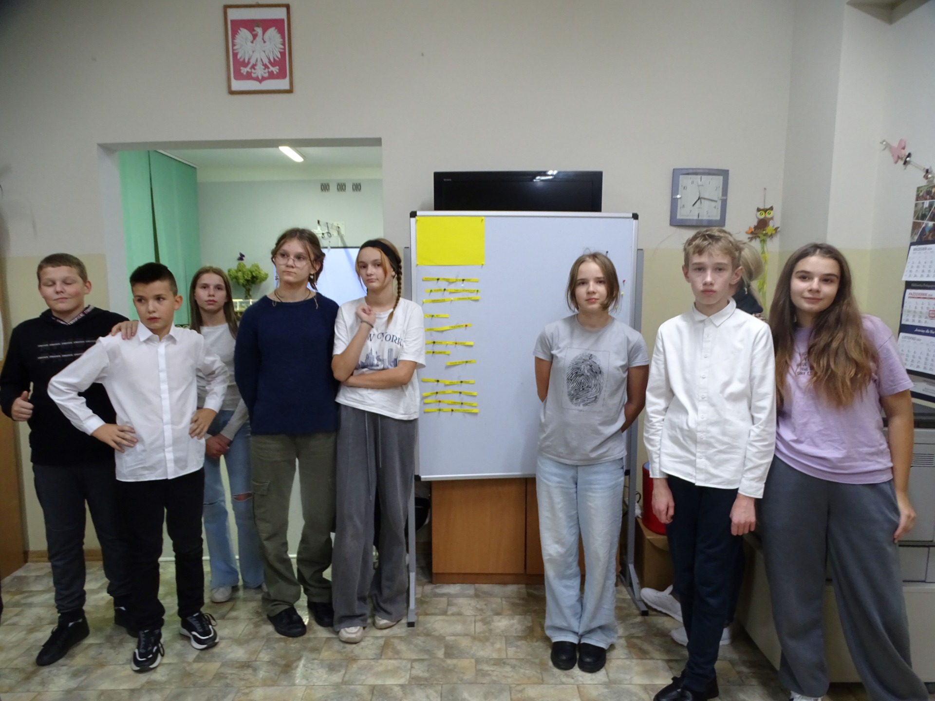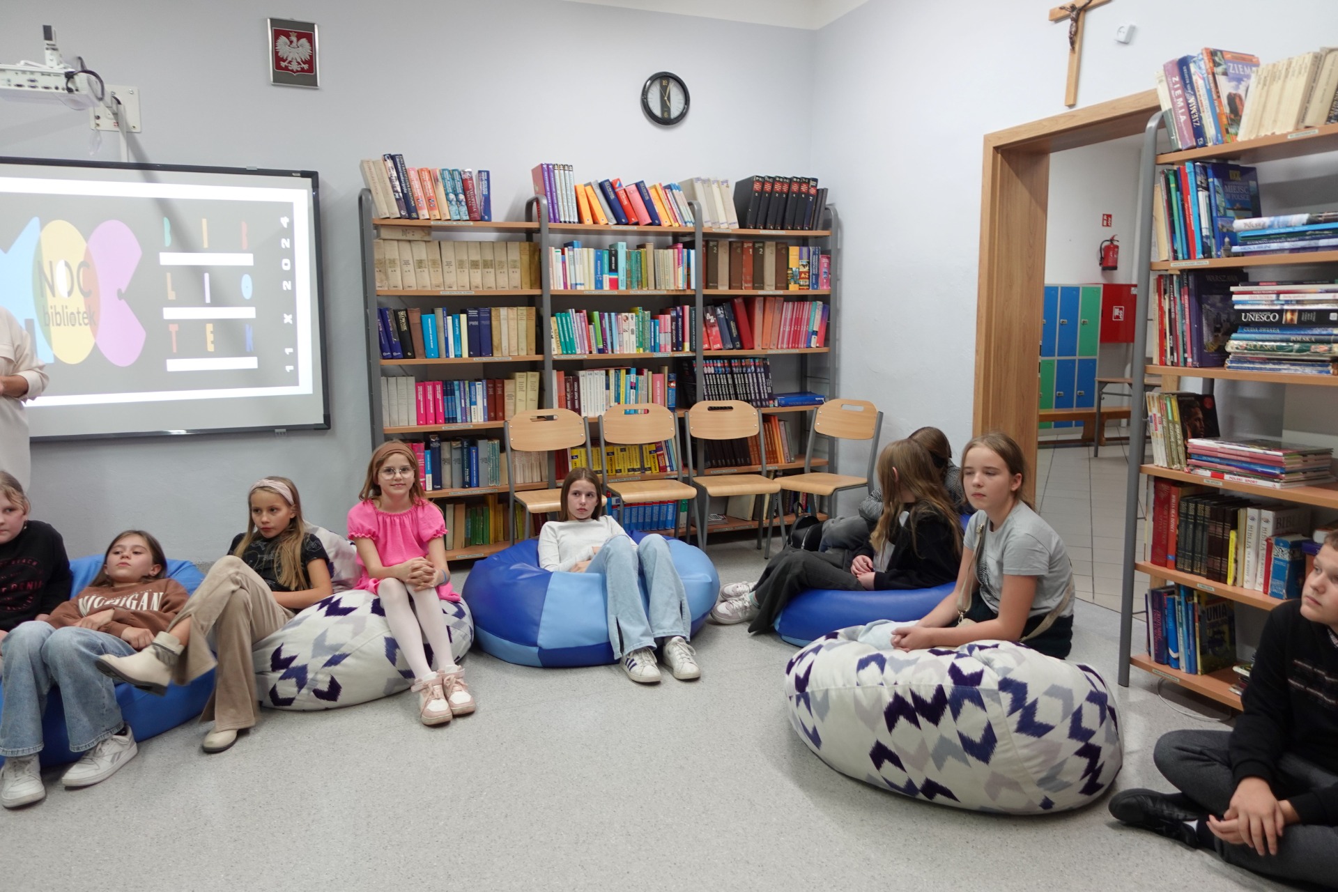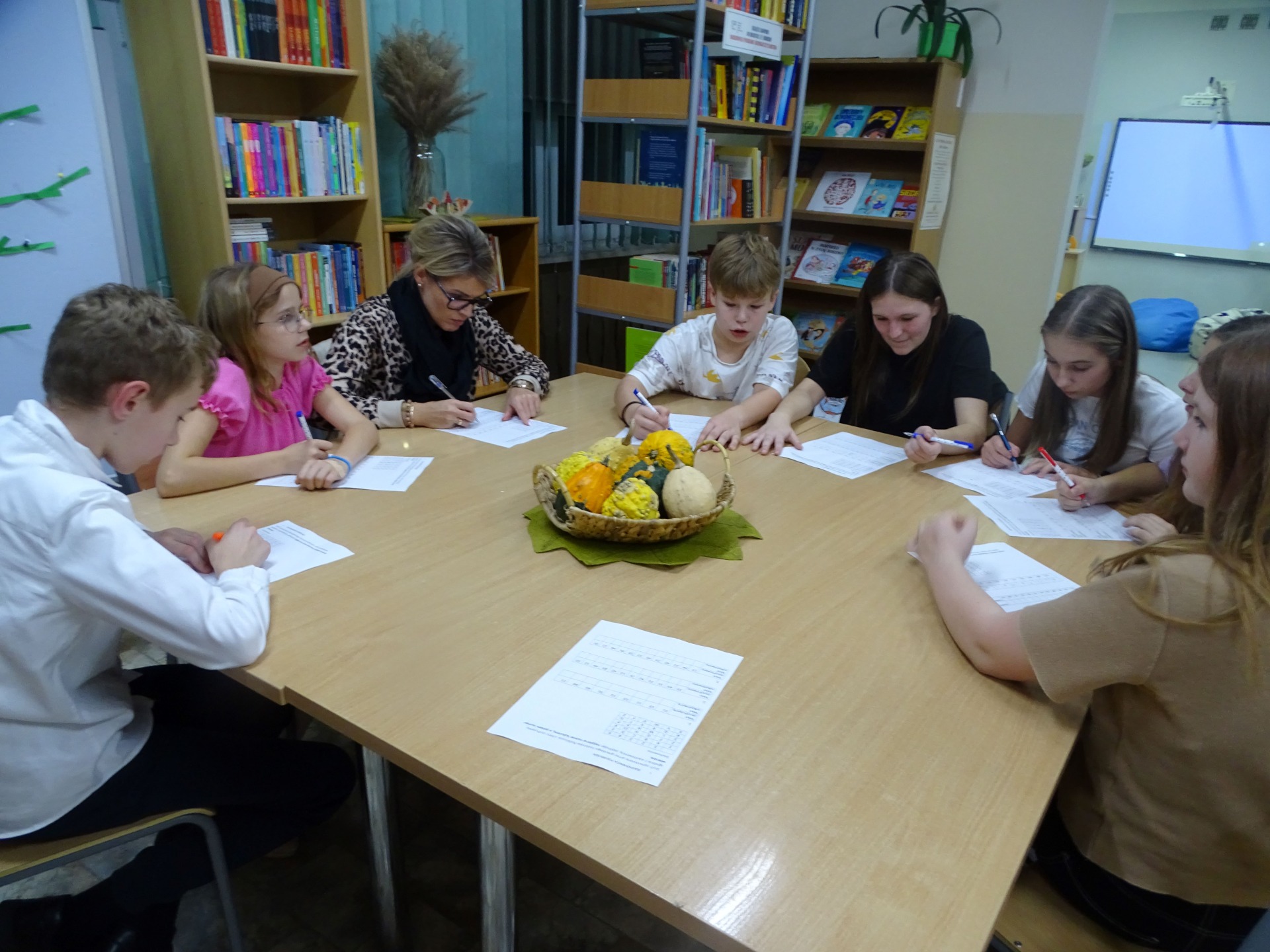 W tym roku nasza szkolna Noc Bibliotek odbyła się w piątek 18.10.2024 r. w godz. 1700- 2000. Chętnych do udziału w tej imprezie było wielu, niestety ze względów organizacyjnych musieliśmy ograniczyć liczbę uczestników. Wzięli w niej udział członkowie Szkolnego Koła Teatralnego. Tuż po godzinie 1700 i krótkim powitaniu przez organizatorów rozpoczęła się wieczorna przygoda z czytaniem. W tym roku spotkanie rozpoczęliśmy od przedstawienia teatralnego w wykonaniu członków Szkolnego Koła Teatralnego, którzy specjalnie na tę okazję przygotowali spektakl pod tytułem :„Trudna decyzja” na motywach „ Ani z Zielonego Wzgórza”. Do obejrzenia przedstawienia zaprosiliśmy Rodziców naszych małych artystów, dyrekcję szkoły oraz panią Kamilę Drab-Stasiewicz z Gminnej Biblioteki Publicznej wszyscy byli zachwyceni. Spektakl został także sfilmowany i zamieszczony na naszej szkolnej stronie internetowej. Zgodnie z hasłem tegorocznej Nocy Bibliotek przez cały wieczór udowadnialiśmy MOC BIBLIOTEK. Po krótkiej chwili wytchnienia po spektaklu nastąpił ciąg dalszy spotkania. Nasza pani od polskiego przeczytała wiersz M. Strzałkowskiej „ Moc Bibliotek”. W dalszej części spotkania na uczestników czekały liczne konkursy, gry i zabawy: - „ Trening pamięci” uczestnicy musieli zapamiętać przez dwie minuty jak najwięcej tytułów przedstawionych im książek, a następnie je zapisać