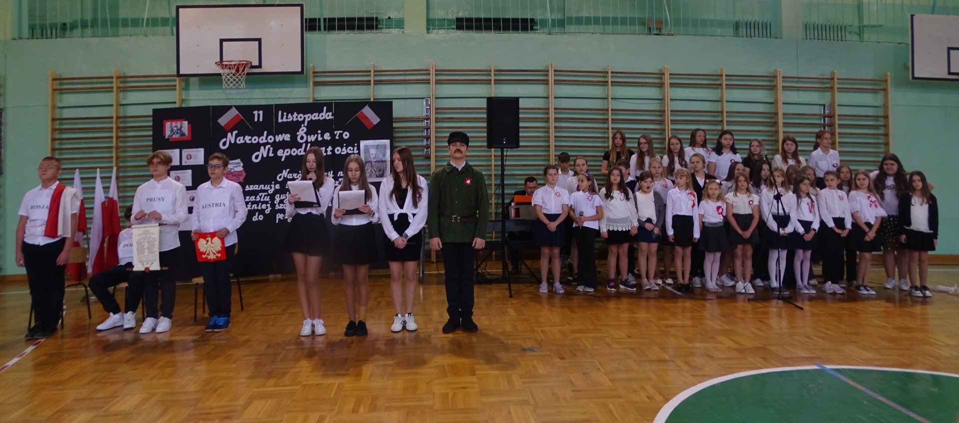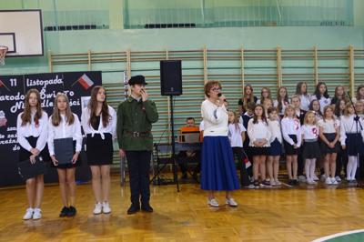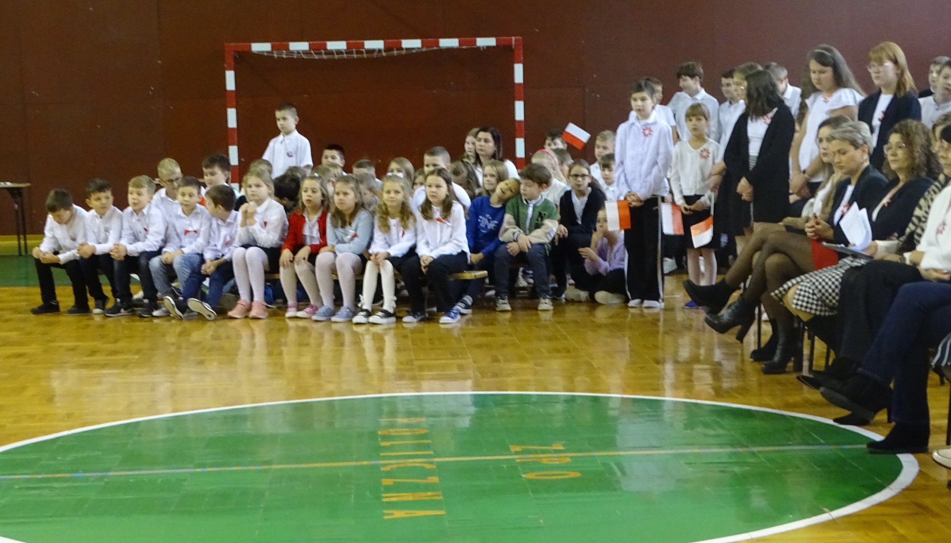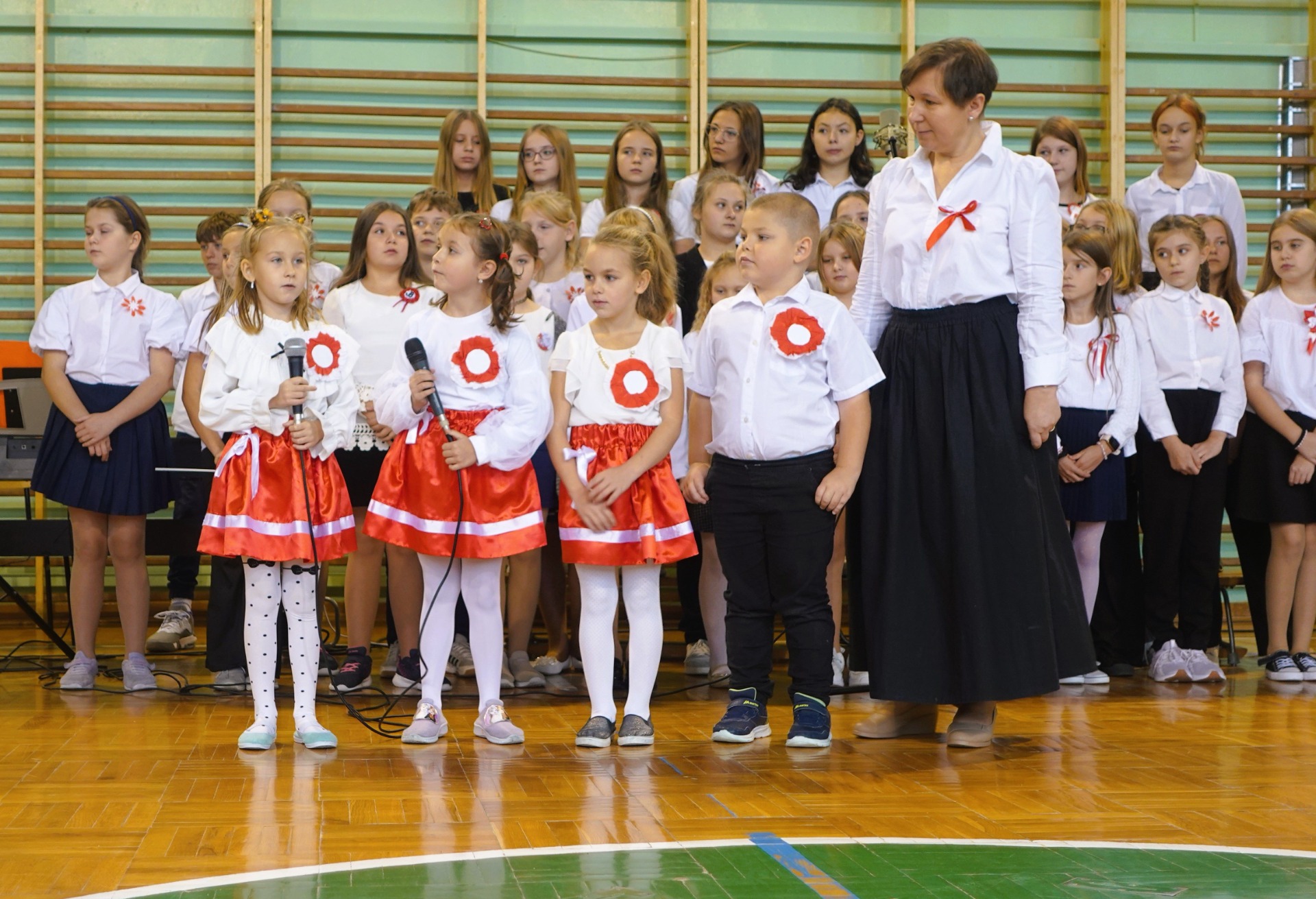 Uroczystość rozpoczęła się od odśpiewania „Mazurka Dąbrowskiego” punktualnie o godzinie 11.11. W ten sposób szkoła wzięła udział w ogólnopolskiej akcji „Szkoła do hymnu”. Następnie dzieci z oddziałów przedszkolnych przedstawiły trudną drogę do niepodległości Polski, pięknie wykonując piosenkę „To właśnie jest niepodległość”, która stanowiła doskonałe wprowadzenie do występu słowno- muzycznego przygotowanego przez uczniów klas IV-VIII.