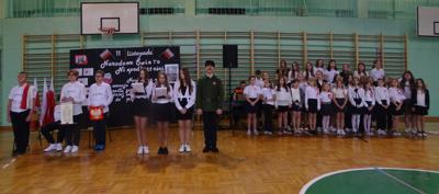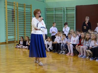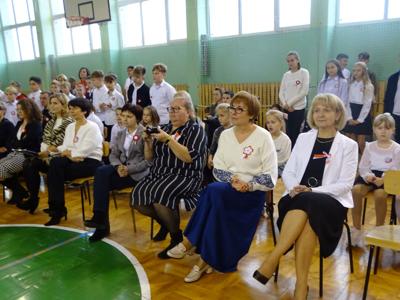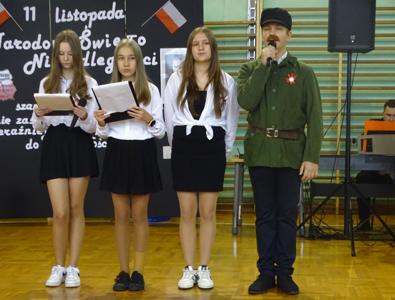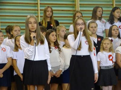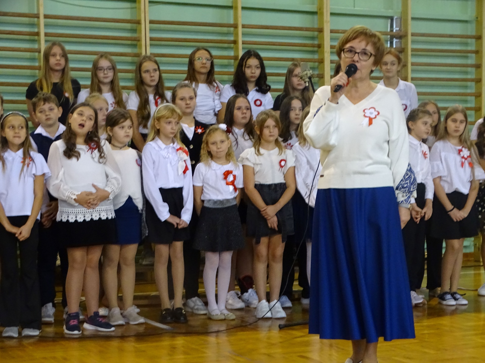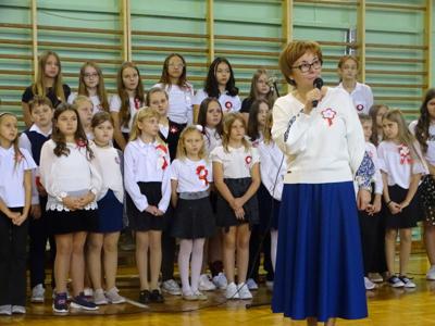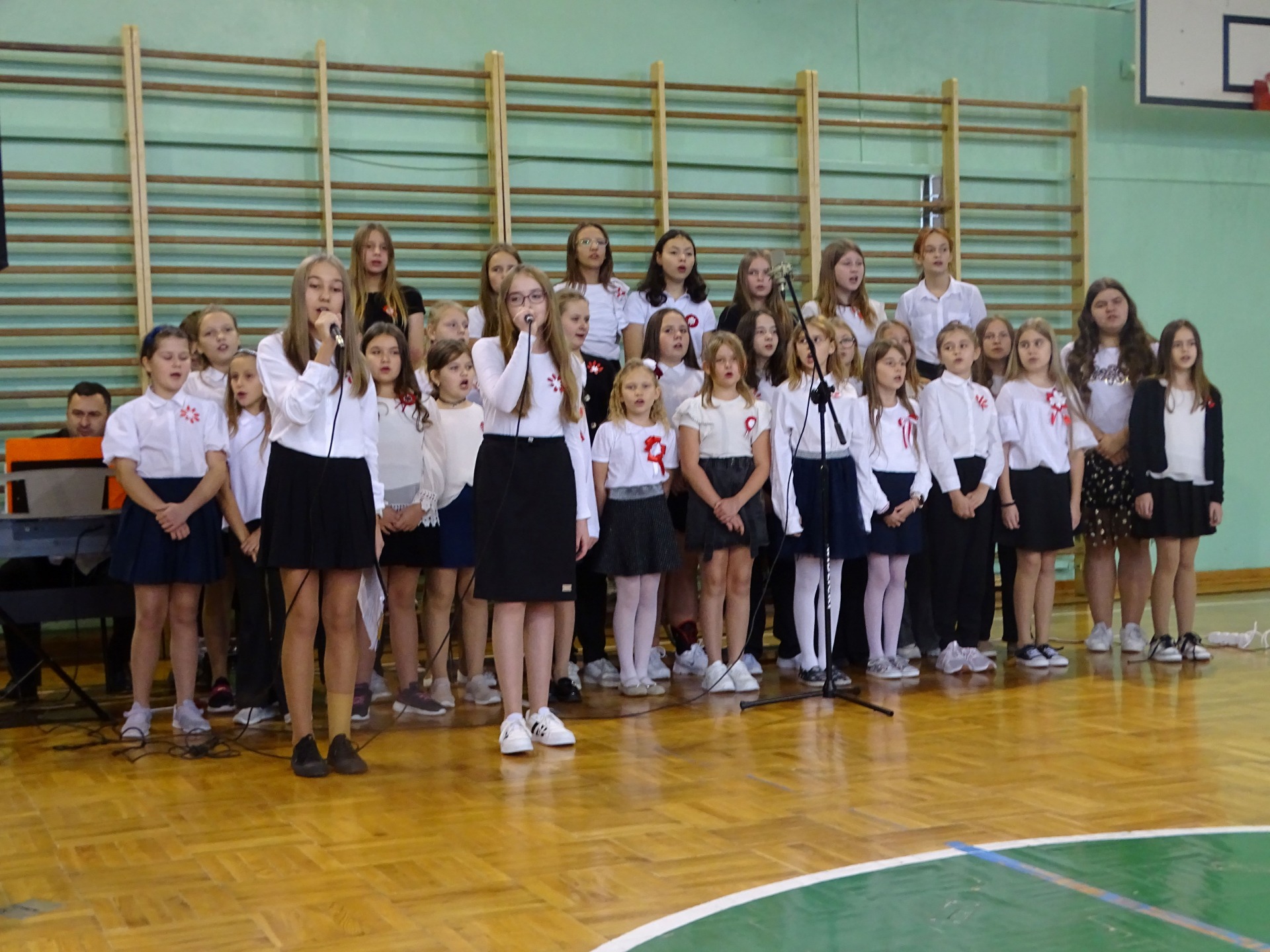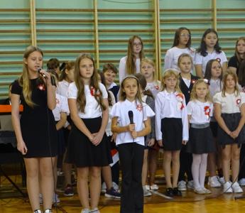 Uroczystość rozpoczęła się od odśpiewania „Mazurka Dąbrowskiego” punktualnie o godzinie 11.11. W ten sposób szkoła wzięła udział w ogólnopolskiej akcji „Szkoła do hymnu”. Następnie dzieci z oddziałów przedszkolnych przedstawiły trudną drogę do niepodległości Polski, pięknie wykonując piosenkę „To właśnie jest niepodległość”, która stanowiła doskonałe wprowadzenie do występu słowno- muzycznego przygotowanego przez uczniów klas IV-VIII.