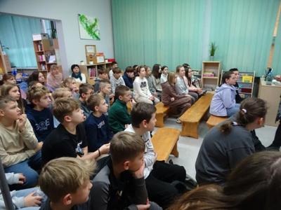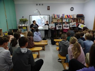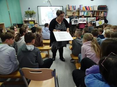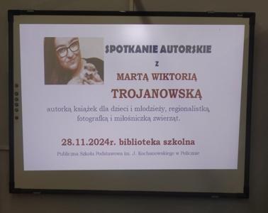 W czwartek, 28.11.2024r. w bibliotece szkolnej odbyło się spotkanie autorskie z pisarką Martą Wiktorią Trojanowską – autorką książek dla dzieci i młodzieży, bibliotekarką, regionalistką, miłośniczką starych fotografii i zwierząt, właścicielką myszek, jeża i kolekcji ponad 100 wydań „Alicji w krainie czarów”.