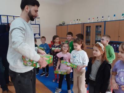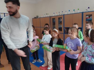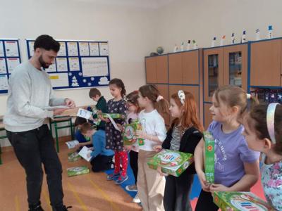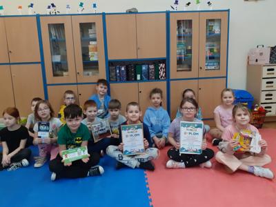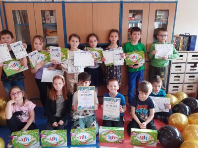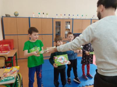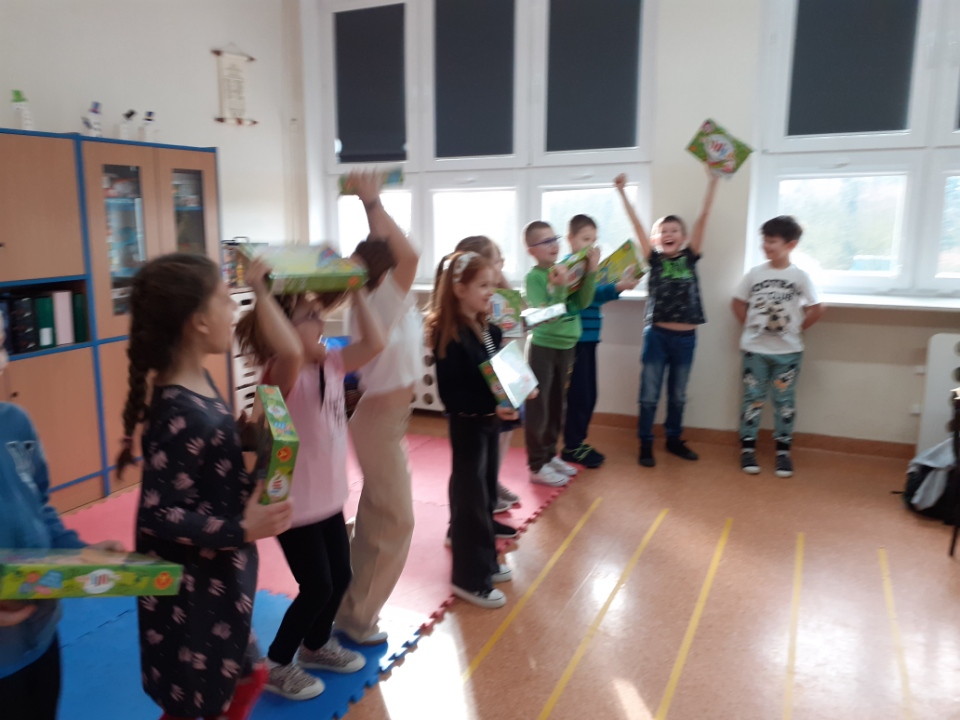Przed feriami uczniów odwiedził dziennikarz, który wręczył im wygrane nagrody: gry planszowe, notesy, plany lekcji. Klasa otrzymała również bilety do Europejskiego Centrum Bajki w Pacanowie, voucher na pobyt w parku trampolin oraz bilety do Kosmicznego Rancza. Dziękujemy wszystkim, którzy przyczynili się do tego sukcesu, a zwłaszcza rodzicom, którzy odegrali kluczową rolę w tym zwycięstwie.