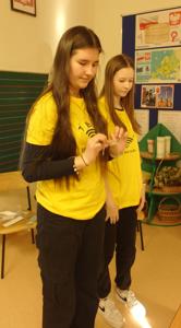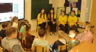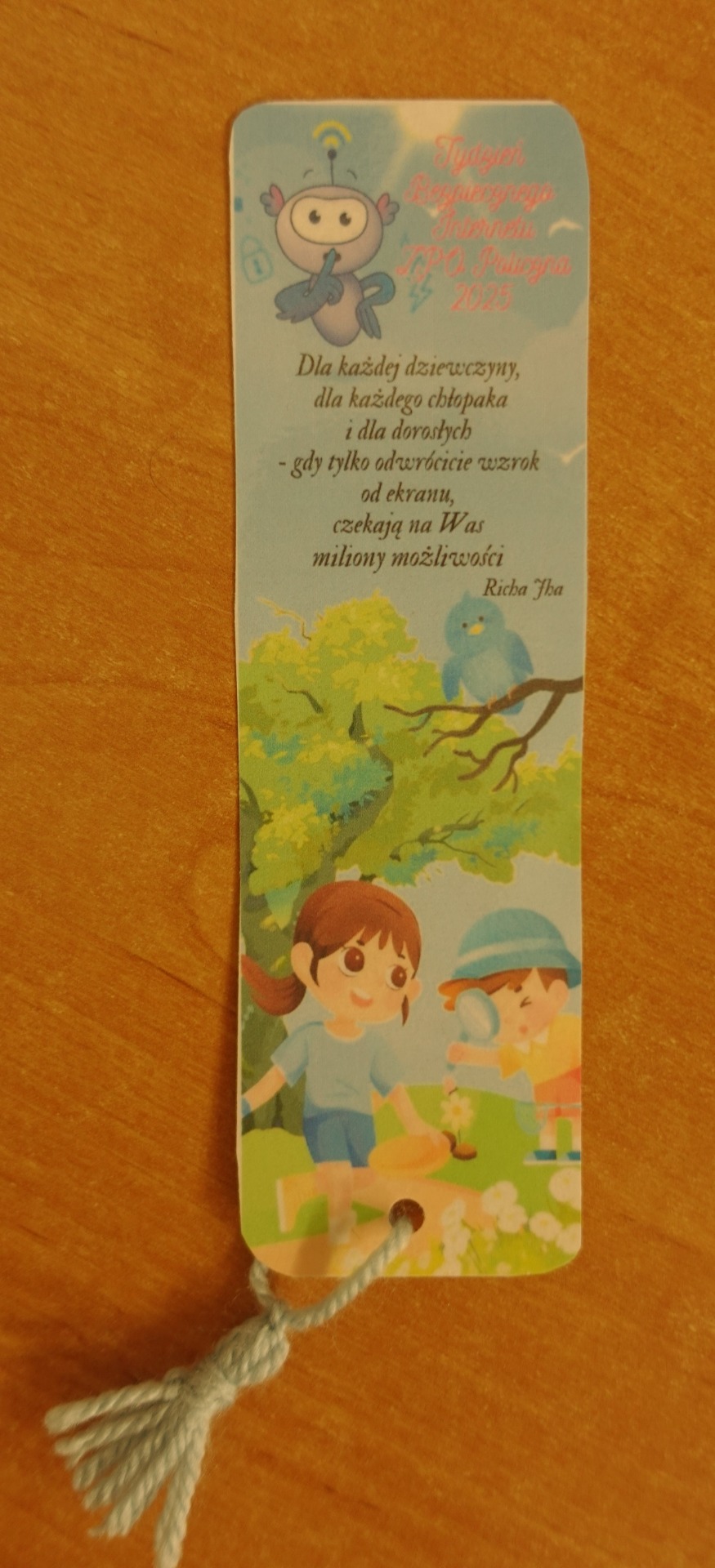 Najmłodsi uczniowie mieli okazję wysłuchać książki poruszającej temat higieny cyfrowej "Mania klikania", którą przeczytały im uczennice z klas VIIIb i VIb. Po lekturze dzieci z pomocą starszych koleżanek wykonały chwosty do zakładek, na których znalazło się motto z książki: „Dla każdej dziewczyny, dla każdego chłopaka i dla dorosłych - gdy tylko odwrócicie wzrok od ekranu, czekają na Was miliony możliwości”.