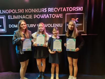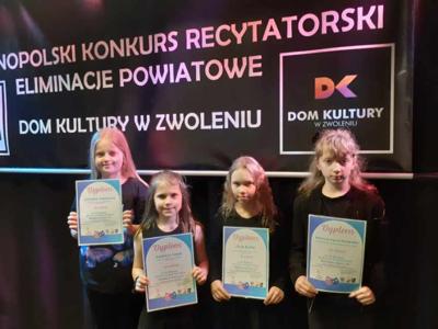 Wysoki poziom tegorocznego konkursu w Zwoleniu sprawił, że rywalizacja była niezwykle wymagająca. Tym większym powodem do dumy jest sukces naszych uczennic: Gabrysi, Julki, Natalki i Zuzi, które zdobyły wyróżnienie. Wszystkim recytatorkom gratulujemy talentu artystycznego, a wyróżnionym dziewczynkom sukcesu!