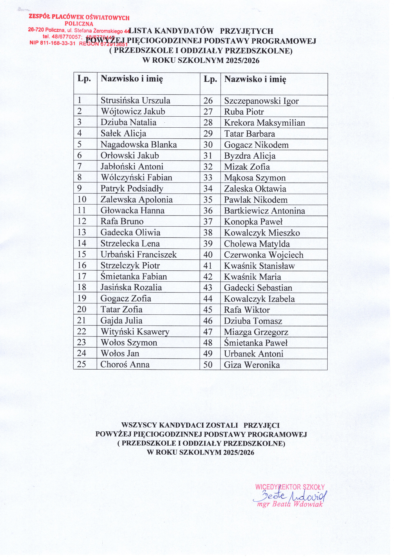 LISTA KANDYDATÓW PRZYJĘTYCH POWYŻEJ PIĘCIOGODZINNEJ PODSTAWY PROGRAMOWEJ ( PRZEDSZKOLE I ODDZIAŁY PRZEDSZKOLNE) W ROKU SZKOLNYM 2025/2026 Zdjęcia Zobacz również Powitanie wiosny przez uczniów klas I-III LISTA KANDYDATÓW PRZYJĘTYCH DO PRZEDSZKOLA SAMORZĄDOWEGO... LISTA KANDYDATÓW PRZYJĘTYCH DO ODDZIAŁU PRZEDSZKOLNEGO... LISTA KANDYDATÓW PRZYJĘTYCH POWYŻEJ PIĘCIOGODZINNEJ... LISTA KANDYDATÓW PRZYJĘTYCH DO KLASY PIERWSZEJ... IX REGIONALNY KONKURS PIĘKNEGO CZYTANIA - ELIMINACJE... 26 marca 2025 Aktualności Wydrukuj Udostępnij Wyświetlono: 175