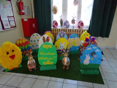 Tegoroczne Święta Wielkanocne w naszej szkole były: niezwykłe, kolorowe, „pisankowe”, radosne. Przygotowania do Wielkiej Nocy rozpoczęliśmy kilka tygodni wcześniej od zakupienia zwykłego styropianu, z którego w efekcie powstały przepiękne, oryginalne, bajecznie kolorowe ogromne pisanki, które udekorowały naszą szkołę. Każda klasa i każdy oddział przedszkolny otrzymał białe styropianowe jajo , a następnie według własnego pomysłu dzieci i uczniowie z pomocą nauczycieli je dekorowali. Efekty ich pracy widać było na wystawie i szkolnych korytarzach. Dodatkowo w różnych miejscach w szkole, na parapetach, półkach z książkami zagościły zajączki, króliczki i inne ozdoby wielkanocne. W tak pięknej scenerii odbył się tegoroczny kiermasz wielkanocny, na którym można było zakupić wykonane przez uczniów i rodziców ozdoby. Cieszył się on ogromnym zainteresowaniem, o czym świadczy sprzedaż wszystkich dekoracji. Kolejnym elementem, który wprowadził całą społeczność szkolną w prawdziwie świąteczny nastrój był uroczysty apel przygotowany przez uczniów klas ósmych oraz szkolny chór i solistów.