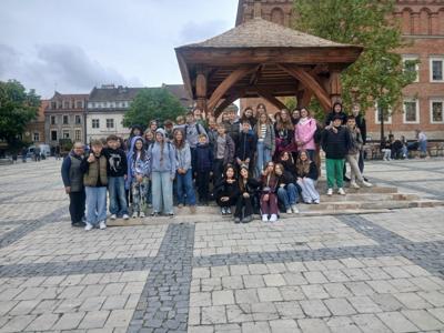 W dniu 23 maja 2025 r. uczniowie klas V-VIII odwiedzili jedno z najstarszych i najpiękniejszych polskich miast - Sandomierz. Zwiedzanie malowniczo położonej osady rozpoczęliśmy od Bramy Opatowskiej, skąd mogliśmy podziwiać skąpaną w deszczu panoramę miasta. W zbrojowni uczniowie mieli okazję obejrzeć oraz przymierzyć średniowieczne stroje rycerskie i zbroje, o których opowiadał prawdziwy rycerz. Niewątpliwą atrakcją była Podziemna Trasa Turystyczna. Spacer średniowiecznymi uliczkami, połączony ze zwiedzaniem kolejnych ciekawych miejsc i zabytków - takich jak Zamek Królewski, Bazylika Katedralna, Ucho Igielne, Spichlerz czy wąwóz lessowy - przybliżył uczniom historię tego wyjątkowego miasta. Wycieczka do Sandomierza była niezapomnianym doświadczeniem, które wzbogaciło wiedzę uczniów i dostarczyło wielu pozytywnych wrażeń.