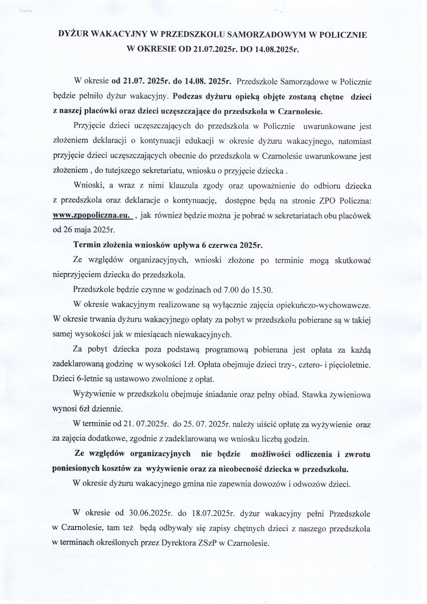 REKRUTACJA DO PRZEDSZKOLA NA WAKACJE W POLICZNIE W załącznikach dokumentacja do rekrutacjj do przedszkola w Policznie na okres wakacji Zdjęcia Załączniki wniosek o kontynuację ( dzieci z Policzny) [32.17 kB] WNIOSEK O PRZYJĘCIE DZIECKA DO PRZEDSZKOLA ( dzieci z Czarnolasu )) [32.86 kB] KLAUZULE ZGODY- dzieci z Czarnolasu [15.94 kB] KLAUZULA INFORMACYJNA ( dzieci z Czarnolasu) [13.33 kB] UPOWAŻNIENIE DO ODBIORU DZIECKA Z PRZEDSZKOLA ( dzieci z Czarnolasu) [13.94 kB] KLAUZULA INFORMACYJNA - do upoważnienia do odbioru dziecka ( Czarnolas) [14.53 kB] Zobacz również Uczniowie klas ósmych na wycieczce zawodoznawczej... ZMIANA ADRESU URZĘDU DANYCH OSOBOWYCH REKRUTACJA DO PRZEDSZKOLA NA WAKACJE W CZARNOLESIE REKRUTACJA DO PRZEDSZKOLA NA WAKACJE W POLICZNIE Dzień Praw Zwierząt Sandomierz 23 maja 2025 Aktualności Wydrukuj Udostępnij Wyświetlono: 100